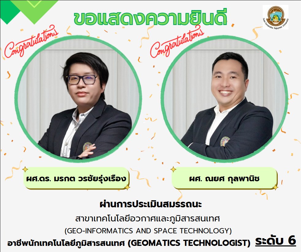 ผ่านการประเมินสมรรถนะ สาขาเทคโนโลยีอวกาศและภูมิสารสนเทศ (Geo-Informatics and Space Technology) อาชีพนักเทคโนโลยีภูมิสารสนเทศ (Geomatics Technologist) ระดับ 6 ประจำปี 2569